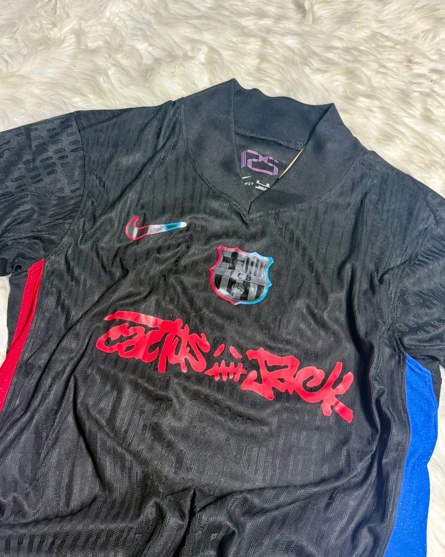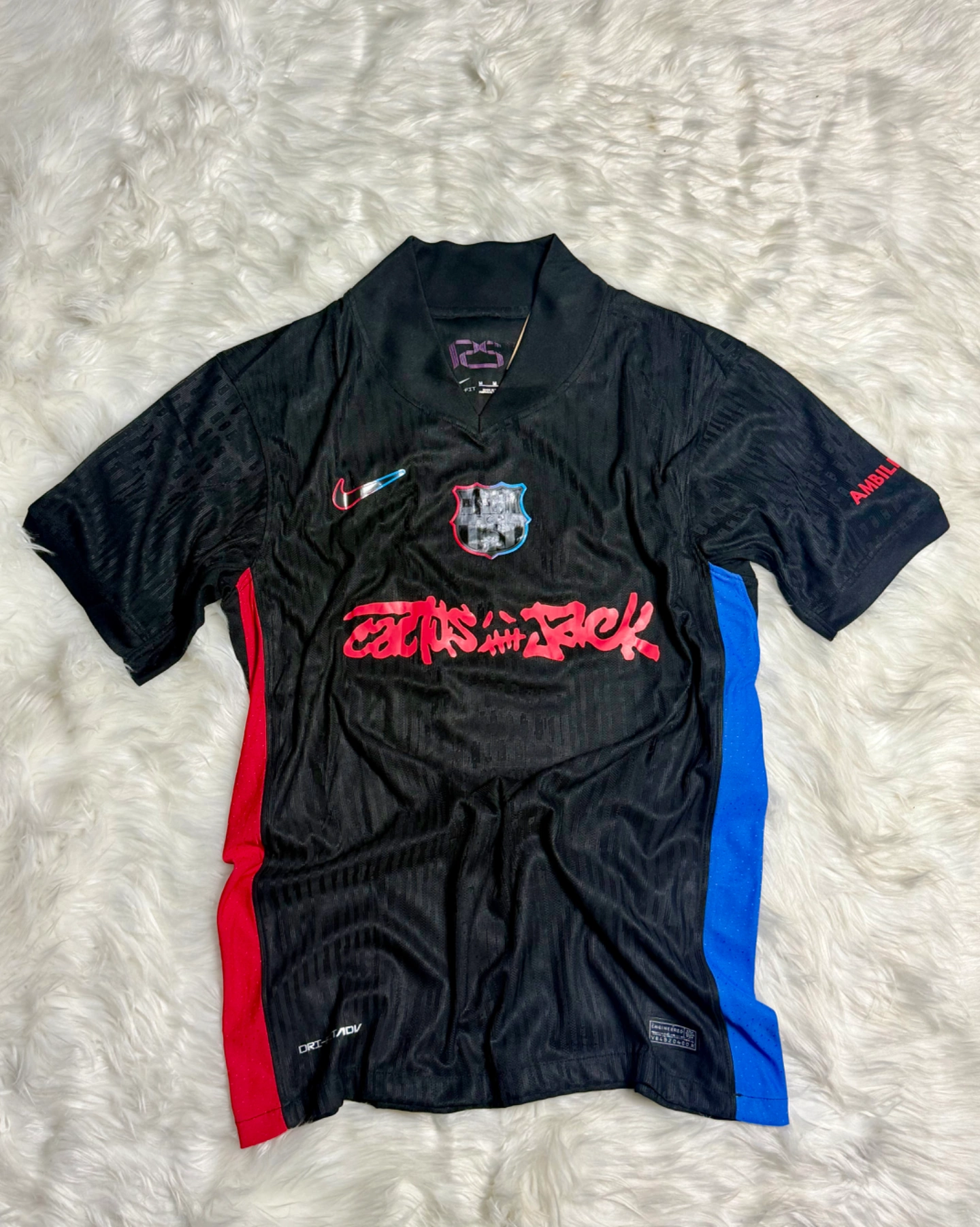 Step into the perfect fusion of football and street culture with the FC Barcelona x Travis Scott Away Jersey. This limited-edition piece blends Barça’s iconic legacy with Travis Scott’s signature “Cactus Jack” aesthetic, creating a bold and exclusive look.