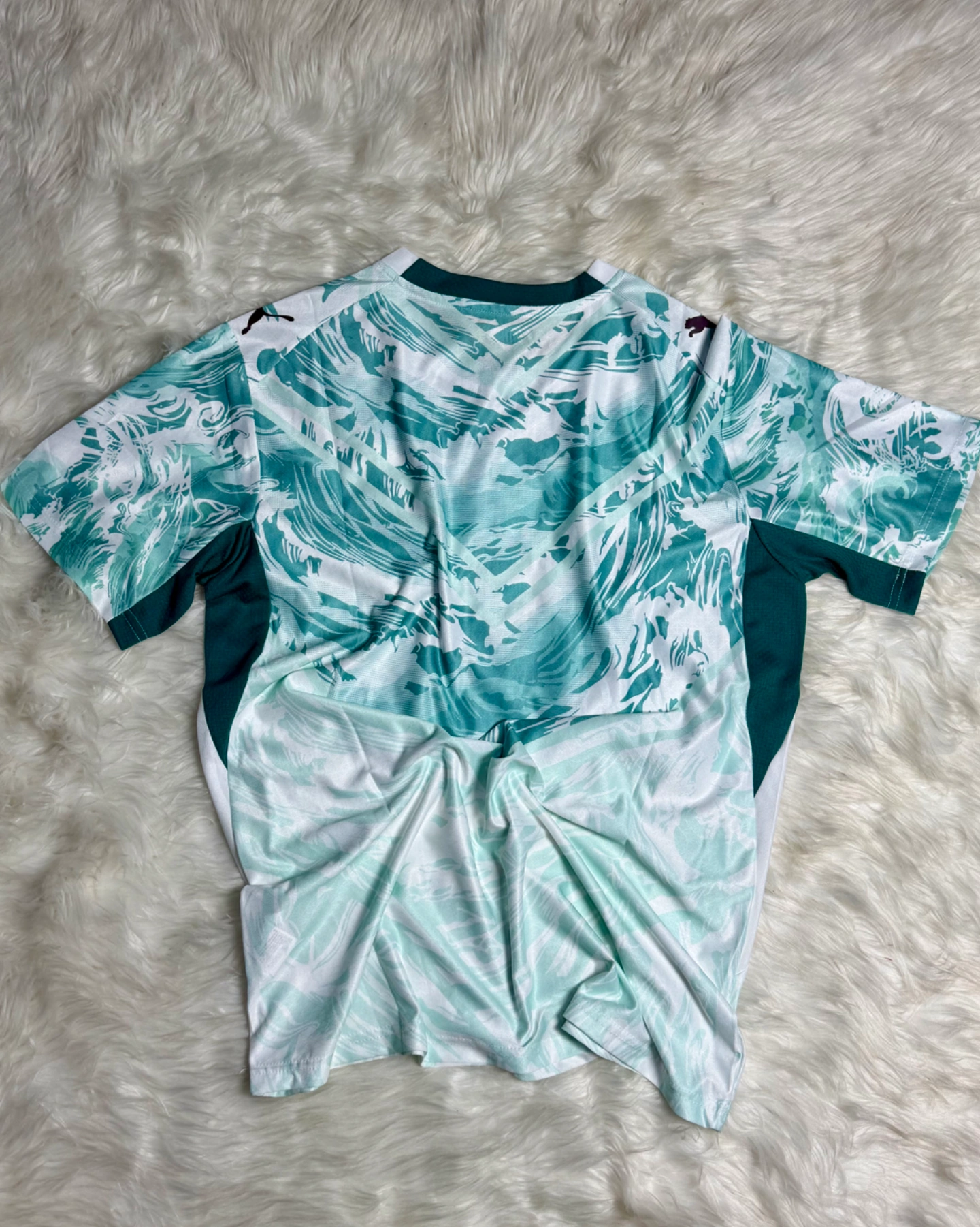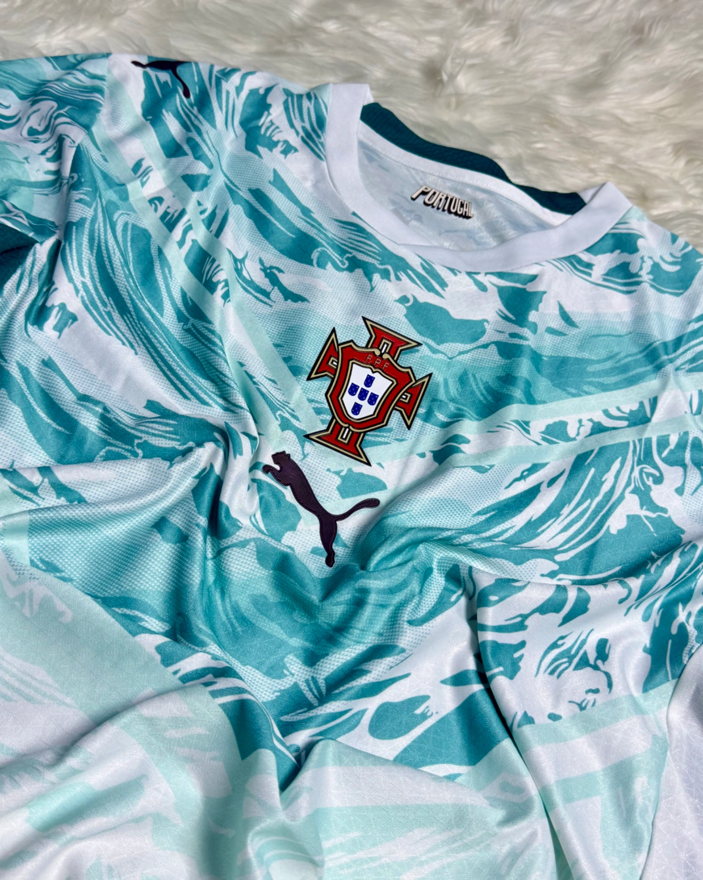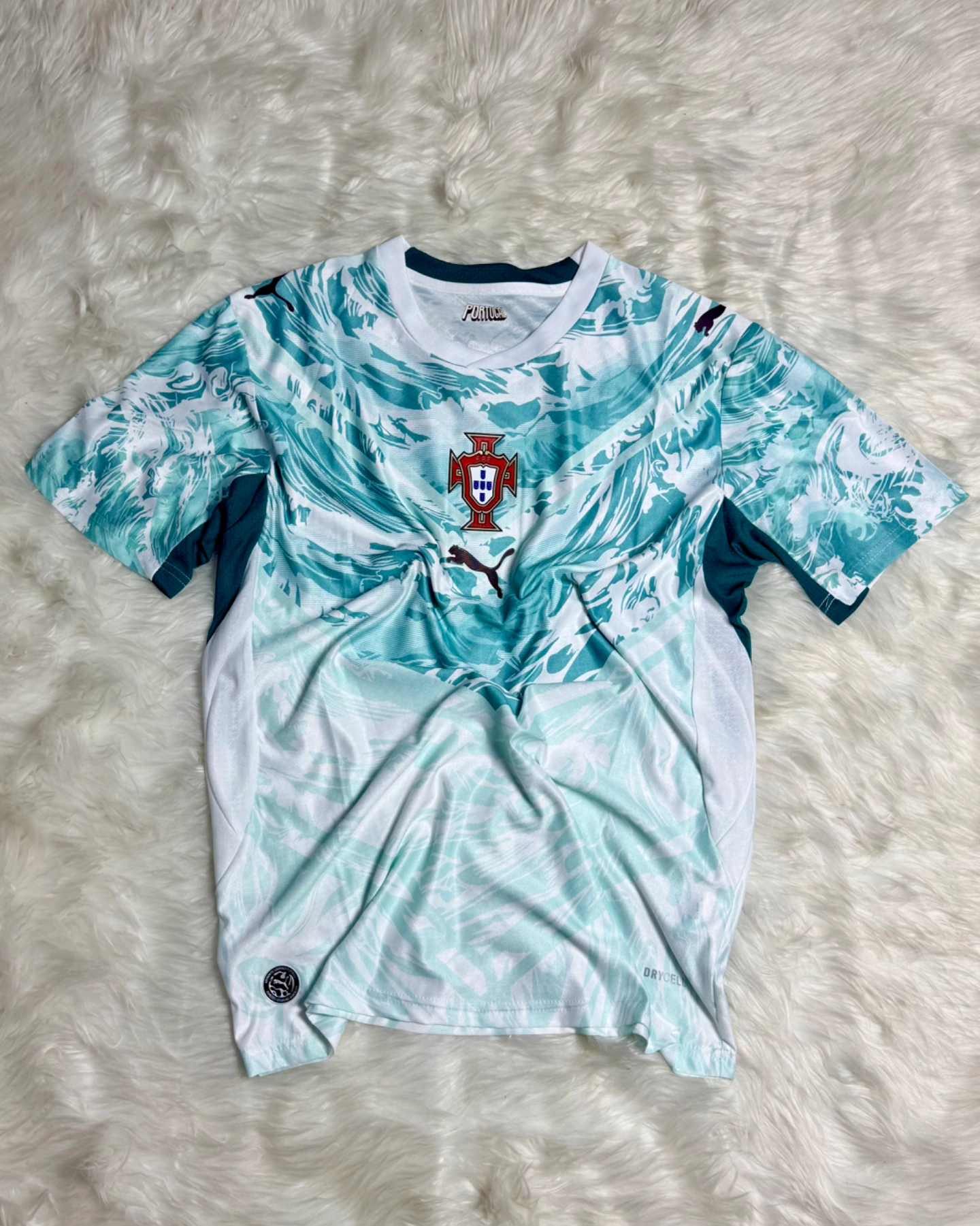 Crafted for both elite athletes and passionate fans, this away jersey reimagines Portugal’s iconic identity with a fresh, contemporary design. The kit features a striking color palette inspired by Portugal’s rich maritime heritage, blending deep ocean hues with vibrant accents that symbolize energy, exploration, and resilience.